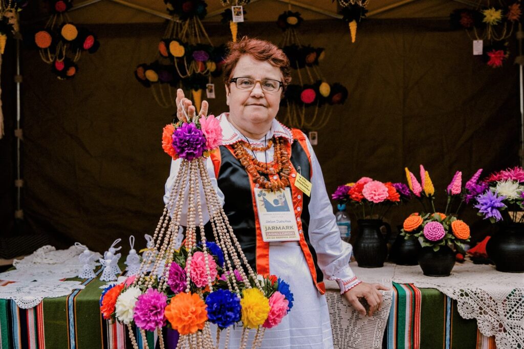 Have you ever noticed how some ornaments from rural cottages resemble those found in grand palaces? It’s hard not to see the connection between the delicate shapes of “pająk” or “kierc” mobiles and elaborate chandeliers. This tradition continues in the Kurpie region, where beautiful kierce, made from peas and tissue paper, are still hung from ceilings.